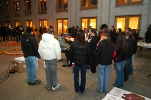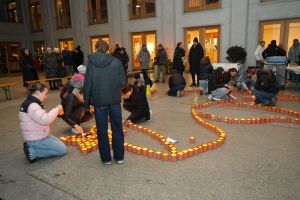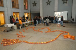 Mit einem abwechslungsreichen Programm aus Musik und Tanz, Texten und Filmen und einem grossen Bodenbild aus Tonkerzen, das eine Friedenstaube darstellte, sollten Geist und Herz geöffnet und der Verein „WEVA“ in Gambia unterstützt werden. Eva Fahlbusch aus Bregenz hat diesen Verein ins Leben gerufen, um die Lebensumstände von Menschen in Gambia so zu verändern, dass sie nicht mehr gezwungen werden, nach Europa zu flüchten. Punsch, selbstgemachte Kuchen und 20 Liter ausgezeichnete Kürbissuppe von „Herraguat“-Mitglied und Lehrer Norman Walch brachten die nötige leibliche Erwärmung. Für eine grosse freudige Überraschung sorgte Thomas Lorenz von der Caritas Liechtenstein, als er am Anfang der Veranstaltung verkünden konnte, dass eine Stiftung 5000 Euro für diesen Anlass spendete. Zusammen mit den grosszügigen Spenden und einem Aufrunden von Seiten der Gymi-For-Change-Gruppe können 6000 CHF dem Verein WEVA nach Gambia übergeben werden, wo diese Summe den über 30-fachen Wirkungswert besitzt. Vielen Dank allen, die gespendet und teilgenommen haben, besonders auch dem Chor der 4. Klassen mit Nina Thüringer-Schiestl und dem Team des SAL, das unsere Aktion wie immer wohlwollend und kompetent unterstützt hat.
