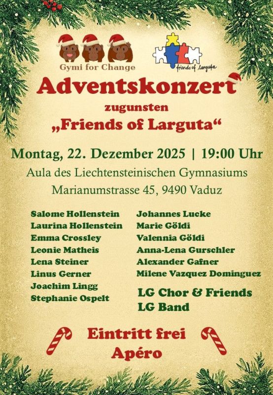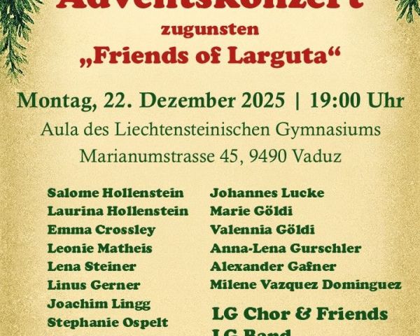 Eines der jährlichen Highlights von Gymi for Change ist auch das Benefizkonzert am Liechtensteinischen Gymnasium. Seit Jahren organisiert die Gruppe ein Konzert, das jeweils wenige Tage vor Weihnachten stattfindet. So wird auch diesen Montag um 19:00 Uhr in der Aula des Liechtensteinischen Gymnasiums erneut ein Benefizkonzert veranstaltet. Wie jedes Jahr geht auch dieses Mal der Erlös an das Projekt Friends of Larguta und steht damit ganz im Zeichen der Nächstenliebe, die gerade in der Weihnachtszeit eine besondere Bedeutung hat.