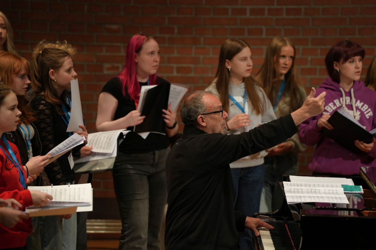 Gemeinsam begannen sie im Halbkreis und teils erhöht stehend das Konzert. Abwechselnd begleitete Rest Tuor und die Chorleiterin aus Island die Schülerinnen und Schüler am Klavier.