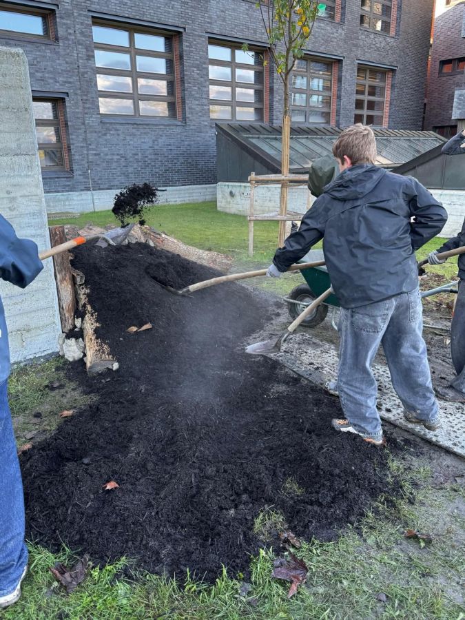 Aus Steinen, Holz und Erde entstand auf dem Schulgelände ein Igelhotel, das zugleich auch Unterschlupf für viele andere Tiere wie Schlangen oder Eidechsen bieten kann. Im Inneren wurde ein kleiner Schacht mit Stroh ausgekleidet, der Igeln als geschützter Platz für den Winter dient.