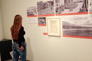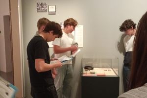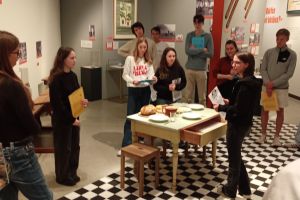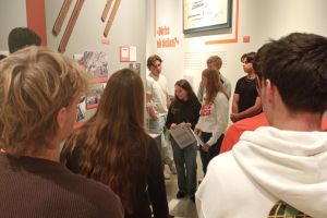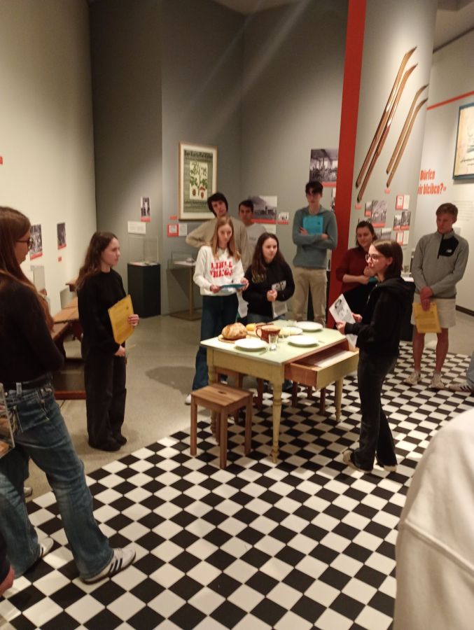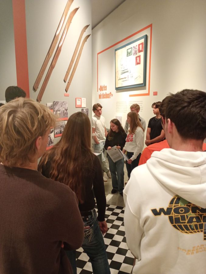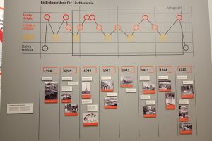 Um die Ausstellung kennenzulernen, wurden wir von unserer fachkundigen Leiterin Chiara Jehle, zuständig für Ausstellung und Kommunikation im Landesmuseum, in drei Gruppen aufgeteilt. Anschliessend lasen wir uns in die zugeteilten Themenbereiche wie „Mit der Schweiz, neben dem Reich“, „Essen, Arbeit, Leben“, „Dürfen wir bleiben?“ oder „Endlich Frieden“ ein. Danach konnten wir uns den jeweiligen Ausstellungsabschnitt gegenseitig erklären. Am Ende der Präsentationen wussten wir also z.B., dass Liechtenstein von den Auswirkungen des Krieges in verschiedenen Bereichen betroffen war, aber von Kampfhandlungen glücklicherweise verschont wurde, wenngleich es auch Liechtensteiner Freiwillige gab, die in den Krieg zogen. Als im Mai 1945 endlich Frieden in Europa herrschte, läuteten auch in Liechtenstein die Kirchenglocken.