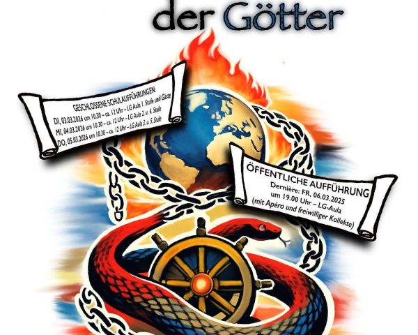 Vom vertrauten Schulzimmer in den göttlichen Olymp träumend, müsste es uns hoffentlich wieder gelingen! Jedenfalls freuen wir uns über alle Theaterbesucherinnen und Theaterbesucher, ob nun in schulischer Beglückung oder in freizeitlicher Entzückung am Freitagabend samt Apéro!